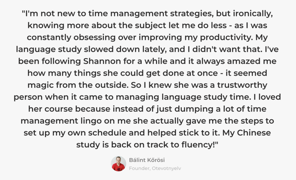 I created Language Learning Accelerator to share the exact strategies and tools that I use to be a productive language learner. I haven’t always effectively managed my time, but with the experience of learning and maintaining close to ten languages, I’ve picked up a lot of tactics to change that.
