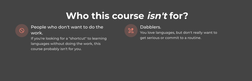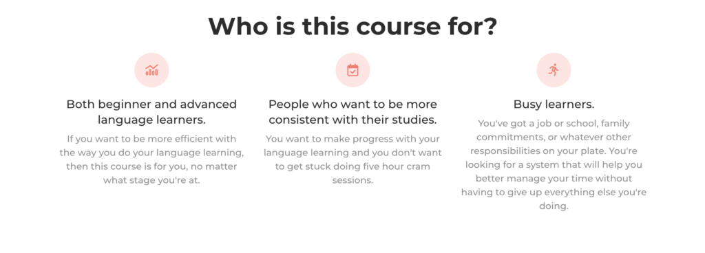 But I don’t want you to spend all that time going through the same long and frustrating process that I did, which is why I’ve worked hard to include all of the best practices to fit language learning in to your busy schedule.